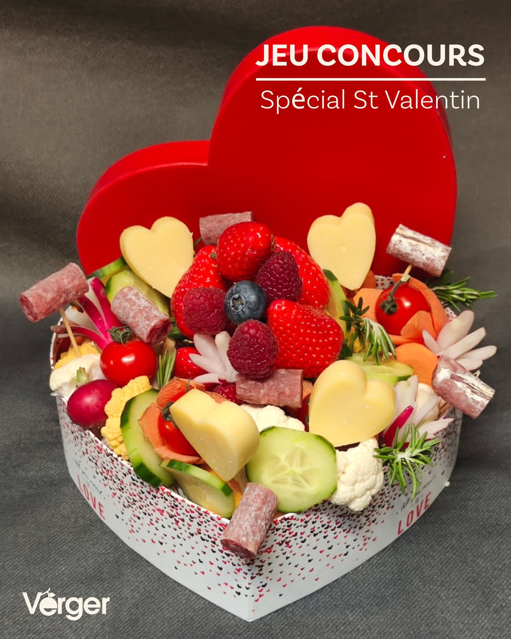 Pour la Saint-Valentin, on vous offre notre magnifique Cœur Primeur : un mix parfait de fruits rouges, légumes, fromages et saucissons. Pour jouer, c’est simple :
