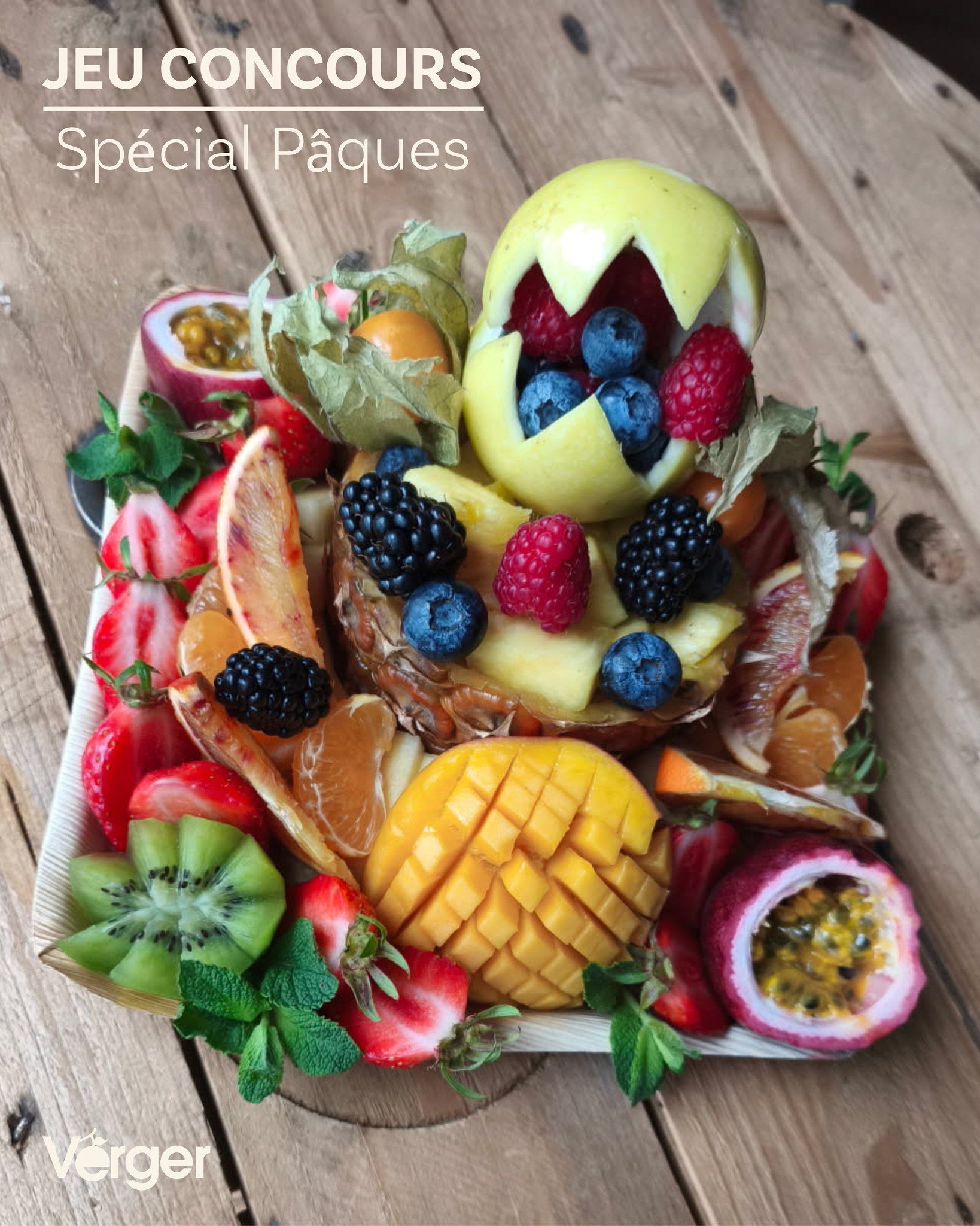 JEU CONCOURS de Pâques ! 🐰 Oubliez les chocolats qui fondent à force d’être oubliés… Offrez un joli plateau de fruits estival ! Pour Pâques, on vous offre notre magnifique composition de Pâques : un mix parfait d’ananas, melon, mangue, kiwi, fruit de la passion, orange et fruits rouges. Pour jouer, c’est simple :